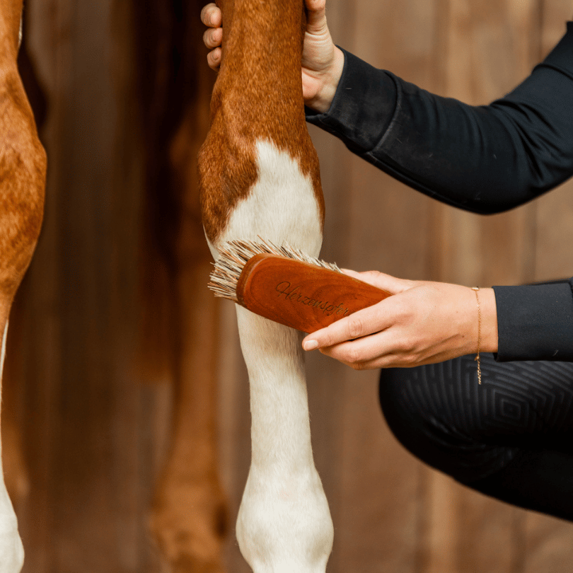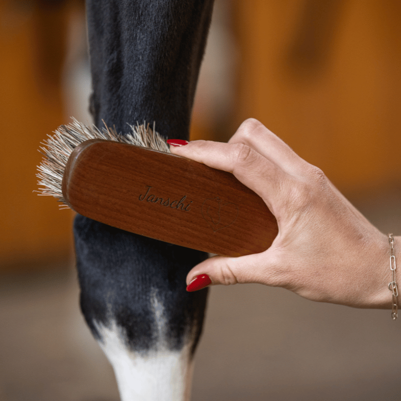 - Ziegenhaarbürste: Extrem weiche Bürste für die „Feinarbeit“. Sie entfernt den letzten Staub, sorgt für Hochglanz und ist besonders angenehm für sensible Pferde. Auch perfekt für den Kopf oder empfindliche Bereiche.
