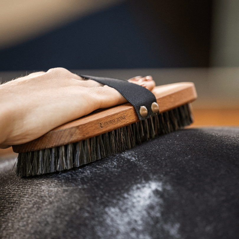 Der handgefertigte Bürstenkörper aus FSC®-zertifizierter, geölter Thermo-Buche liegt angenehm in der Hand, während der elastische Gurt sicheren Halt bietet und sich jeder Reiterhand perfekt anpasst.