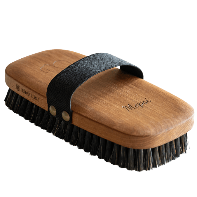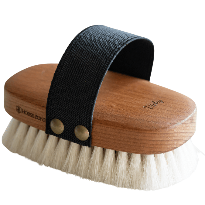 Der handgefertigte Bürstenkörper aus FSC®-zertifizierter, geölter Thermo-Buche liegt angenehm in der Hand, während der elastische Gurt sicheren Halt bietet und sich jeder Reiterhand perfekt anpasst.
